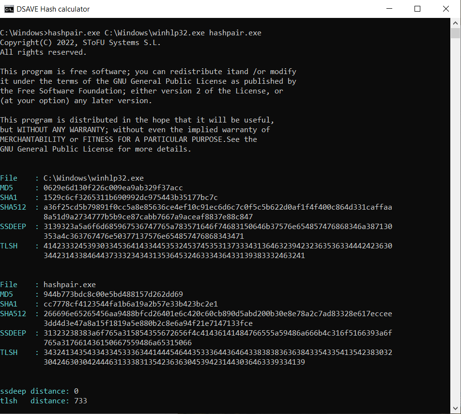SSDEEP says the files are completely different, with 0% matches. TLSH algorithm says that the files differ significantly, by 73.3%. These files were compiled by different companies, using different libraries and different compilers. These files have different VERSION_INFO and different MZ headers. Thus, the TLSH algorithm allows you to categorize executable files, helping to identify similar malicious files or malicious files of the same family.